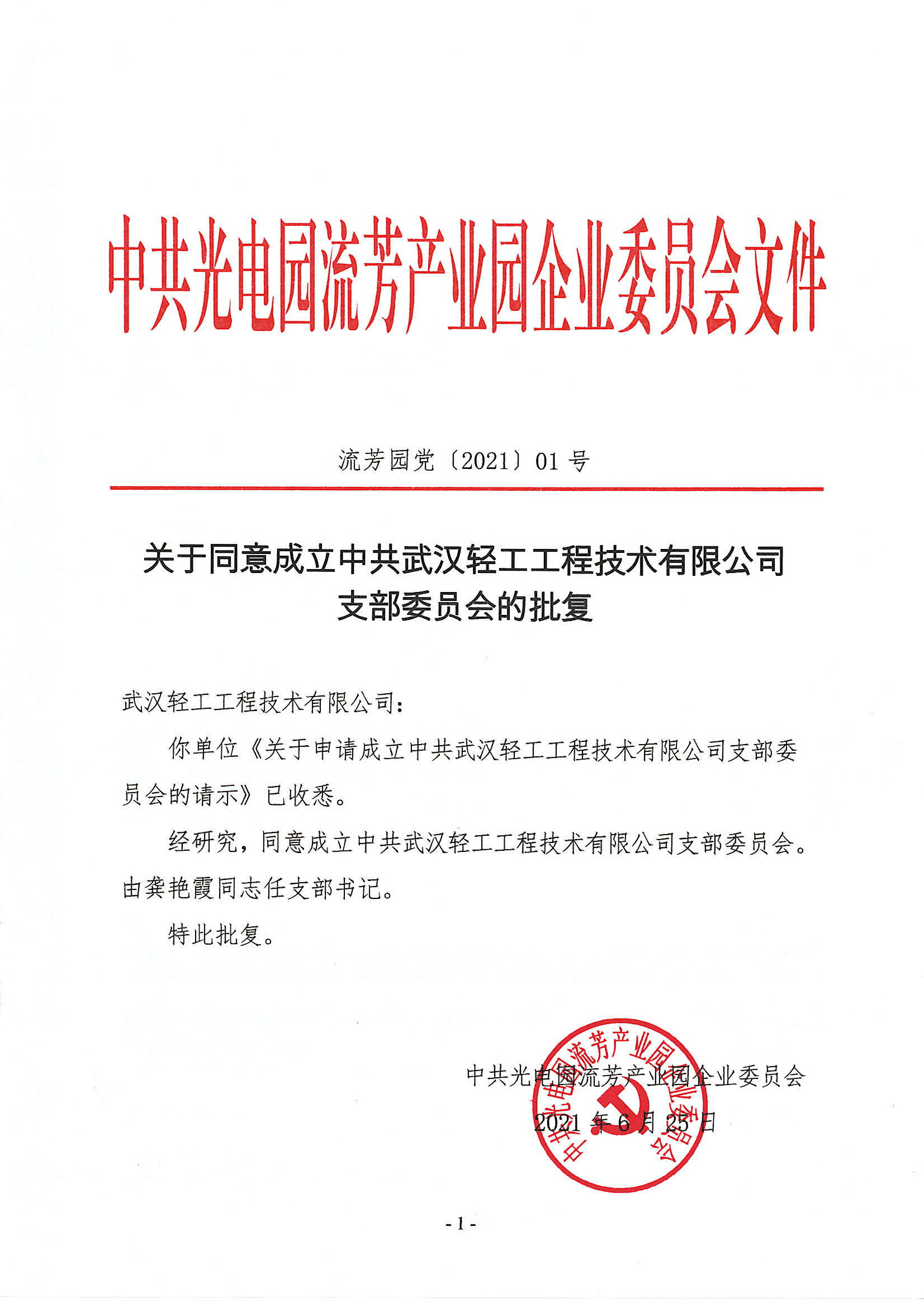 中共光電園流芳產(chǎn)業(yè)園企業(yè)委員會(huì)江峰書(shū)記宣布:經(jīng)多方面核實(shí),武漢輕工工程技術(shù)有限公司員工整體思想認(rèn)識(shí)較高,業(yè)務(wù)能力較強(qiáng),生活上相互關(guān)心,同事之間相處融洽,充分發(fā)揚(yáng)了黨組織戰(zhàn)斗堡壘與黨員在群眾中的模范帶頭作用,同時(shí)規(guī)范黨員組織生活,加強(qiáng)對(duì)黨員同志的組織管理,從而增強(qiáng)了公司員工的凝聚力;按照黨章及有關(guān)規(guī)定,結(jié)合公司實(shí)際情況,同意成立“中共武漢輕工工程技術(shù)有限公司支部委員會(huì)”。